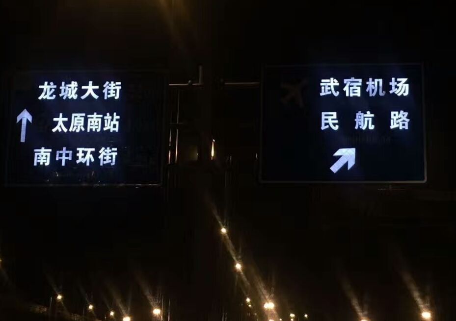 2017年6月,在濟南市安裝了一批面板顯示型主動發(fā)光標志,該標志采用內(nèi)置全光源投射標志面層,標志面層發(fā)光部分采用進口設(shè)備鏤空無筋雕刻,光源穿透鏤空層的專用透光膜,形成面板顯示型主動發(fā)光效果,不僅增強了標志的遠距離視認性和大角度視認,同時也為區(qū)域交通環(huán)境做出了畫龍點睛的效果,為地區(qū)打造交通亮點,樹立城市示范大道,提供了創(chuàng)新元素。
