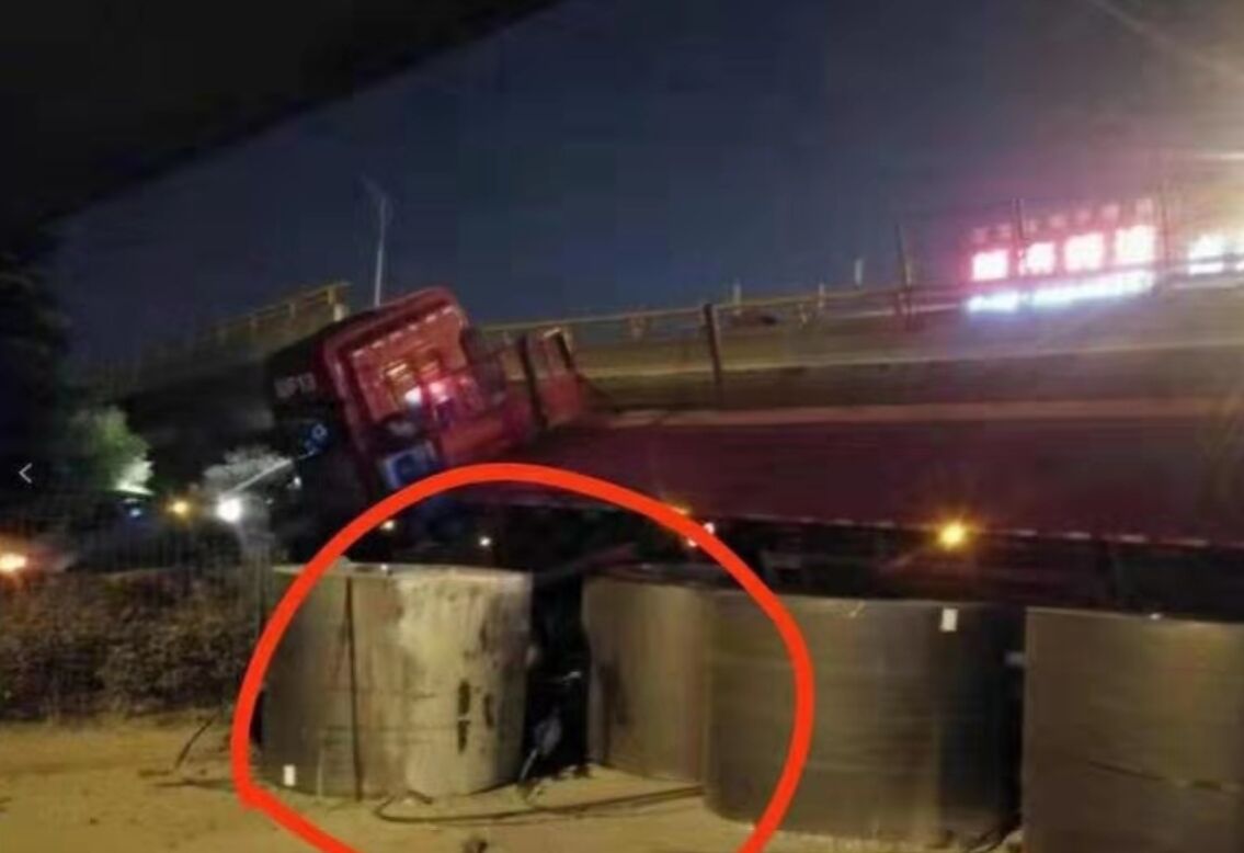 據(jù)了解,事故發(fā)生時(shí),通過的貨車嚴(yán)重超載,承載了6套熱軋卷板,每套重量約28535kg,算一算,貨品總重:28.535噸/卷*6卷=171.210噸。再加上貨車自重,整體重量約190噸。該貨車通行時(shí),行駛路徑為側(cè)邊行走,然后高架橋面?zhèn)确恕?/p>