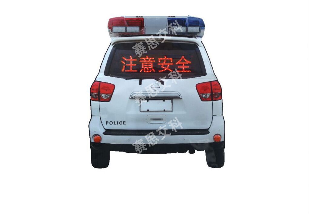 2、基本說(shuō)明:標(biāo)志面層為仿真等比例警車車尾UV噴繪圖案,面層采用鋁質(zhì)板材,標(biāo)志圖案、字樣輪廓嵌入紅色高倍LED發(fā)光管,上置紅、藍(lán)暴閃燈,下方左右各置全紅剎車燈,中間“車窗”設(shè)置發(fā)光警示標(biāo)語(yǔ),整體結(jié)構(gòu)合理,用材精致。