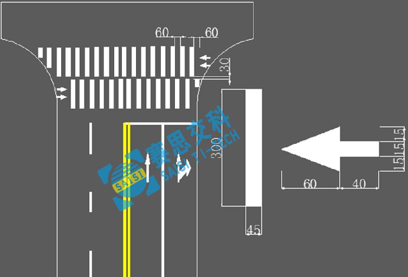為提高人行橫道的通行秩序與效率,在具備可施劃6m寬度人行橫道線的條件下,可采用導(dǎo)向式人行橫道線施劃方式,線寬為45cm,兩段線長(zhǎng)都為3m,兩段線間隔30cm,實(shí)空對(duì)稱(chēng)交錯(cuò)施劃,在人行橫道線的兩端按照靠右通行的習(xí)慣添加導(dǎo)向箭頭,具體尺寸如下圖所示。