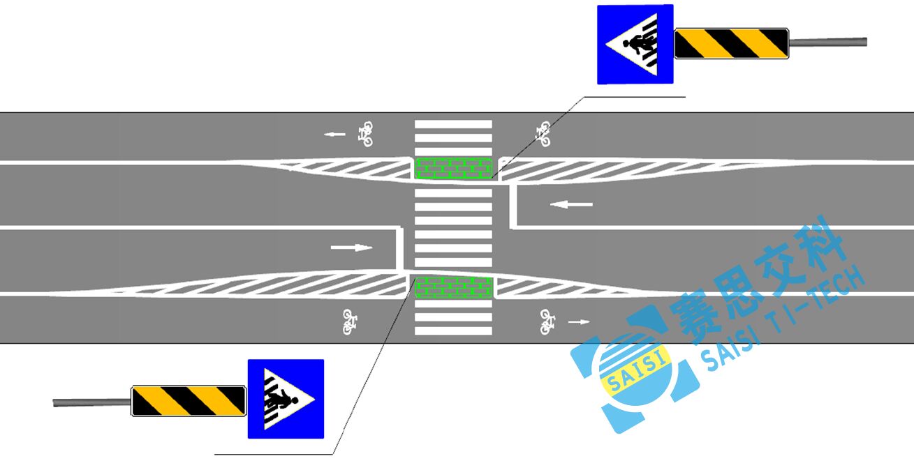 通過(guò)增設(shè)實(shí)體安全島及上游車(chē)道寬度進(jìn)行壓縮,強(qiáng)制車(chē)輛減速行駛,提高行人過(guò)街的安全性。兩端設(shè)置人行橫道指示標(biāo)志,建議采用主動(dòng)發(fā)光工藝,提升標(biāo)志的遠(yuǎn)距離視認(rèn)性,和動(dòng)態(tài)警示性。