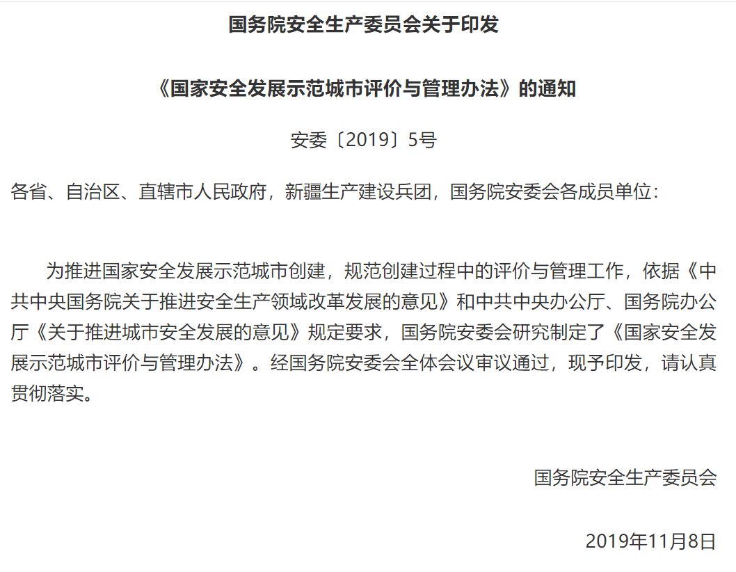 為推進國家安全發(fā)展示范城市創(chuàng)建,規(guī)范創(chuàng)建過程中的評價與管理工作,11月8日,國務(wù)院安全生產(chǎn)委員會,向各省、自治區(qū)、直轄市人民政府,新疆生產(chǎn)建設(shè)兵團,國務(wù)院安委會各成員單位印發(fā)了《國家安全發(fā)展示范城市評價與管理辦法》(以下簡稱“評價辦法”)的通知。