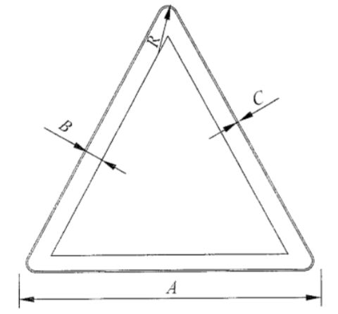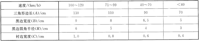 國(guó)標(biāo)《道路交通標(biāo)志和標(biāo)線》(GB5768.2)中明確規(guī)定:警告類標(biāo)志,形狀為正等邊三角型;反光膜顏色為黃、黑主配色;尺寸大小根據(jù)道路設(shè)計(jì)時(shí)速而定,通常有邊長(zhǎng)70cm、90cm、110cm、130cm等四種。參考依據(jù)如下圖所示。