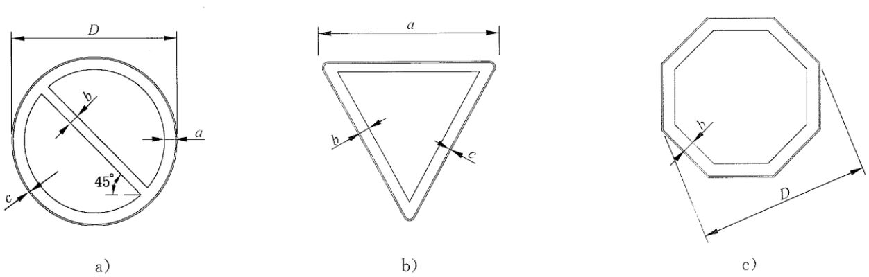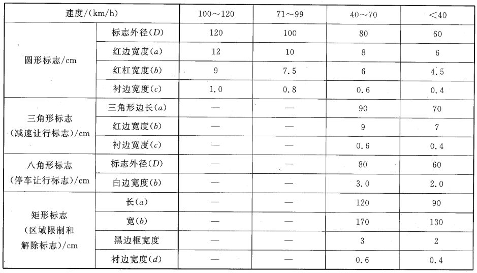依據(jù)國(guó)標(biāo)《道路交通標(biāo)志和標(biāo)線》(GB5768.2)中所列圖案,除部分特殊標(biāo)志,常見的禁令標(biāo)志為圓型,紅色邊框、黑色斜杠。警告類標(biāo)志,具體尺寸大小根據(jù)道路設(shè)計(jì)時(shí)速而定,通常有直徑60cm、80cm、100cm、120cm等四種。參考依據(jù)如下圖所示。