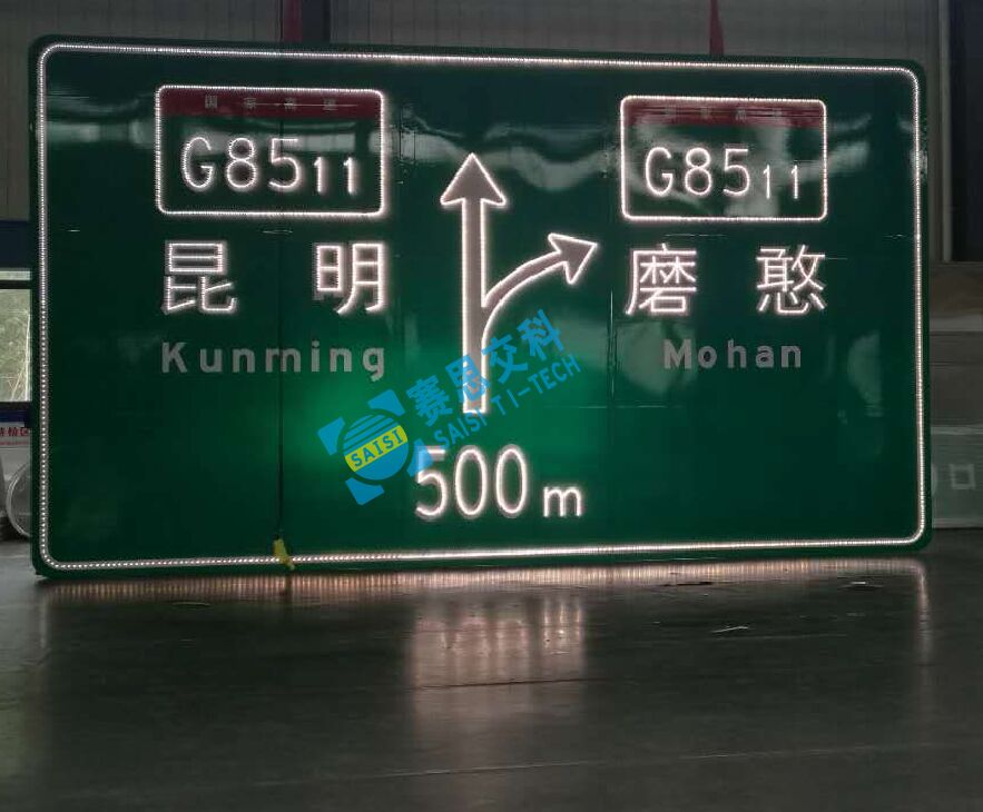 “大型指路類(lèi)點(diǎn)陣型主動(dòng)發(fā)光標(biāo)志”,其標(biāo)志版面中圖案、文字、數(shù)字、字母、邊線等外嵌高亮LED發(fā)光管,并通過(guò)調(diào)光測(cè)試軟件,將LED發(fā)光管合理布點(diǎn),并設(shè)置合理的發(fā)光強(qiáng)度,形成由點(diǎn)光源組成的面光源視認(rèn)效果,實(shí)現(xiàn)標(biāo)志牌能主動(dòng)發(fā)光的功能特性,滿足人眼正常、和諧的視覺(jué)捕捉及視認(rèn)效果。