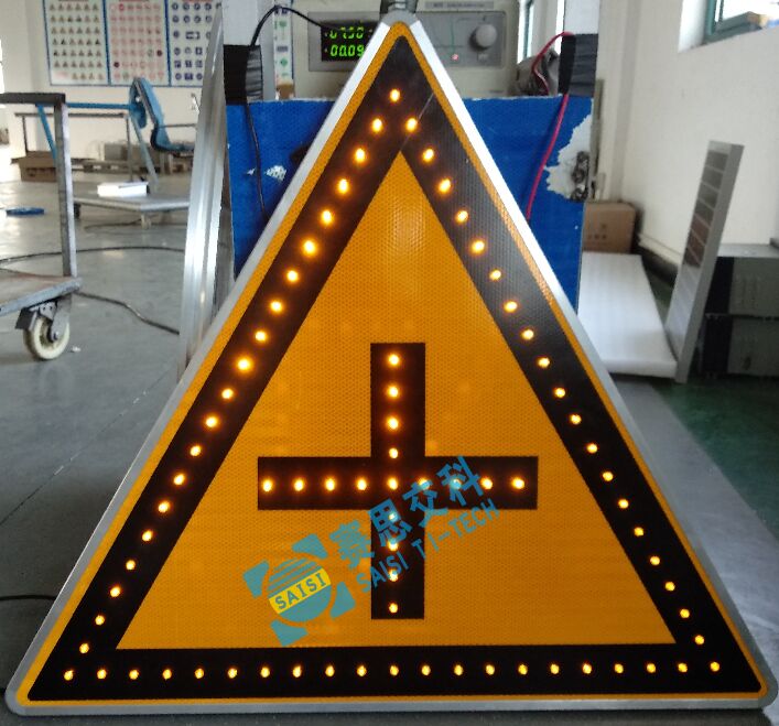 警告類交通標(biāo)志牌,其主要功能為提前警告車輛和行人,注意前方危險源、或可能的危險因素,提醒司機謹慎駕駛。如:“注意兒童標(biāo)志”、“注意前方合流標(biāo)志”、“注意行人標(biāo)志”、“注意橫風(fēng)標(biāo)志”、“注意村莊標(biāo)志”、“事故易發(fā)路段標(biāo)志”等,其形狀通常是三角形;其顏色為黃色、黑色和黑色的指示牌。該類標(biāo)志,通常選用“全透面板型主動發(fā)光標(biāo)志”、“外置點陣型主動發(fā)光標(biāo)志”等類型。