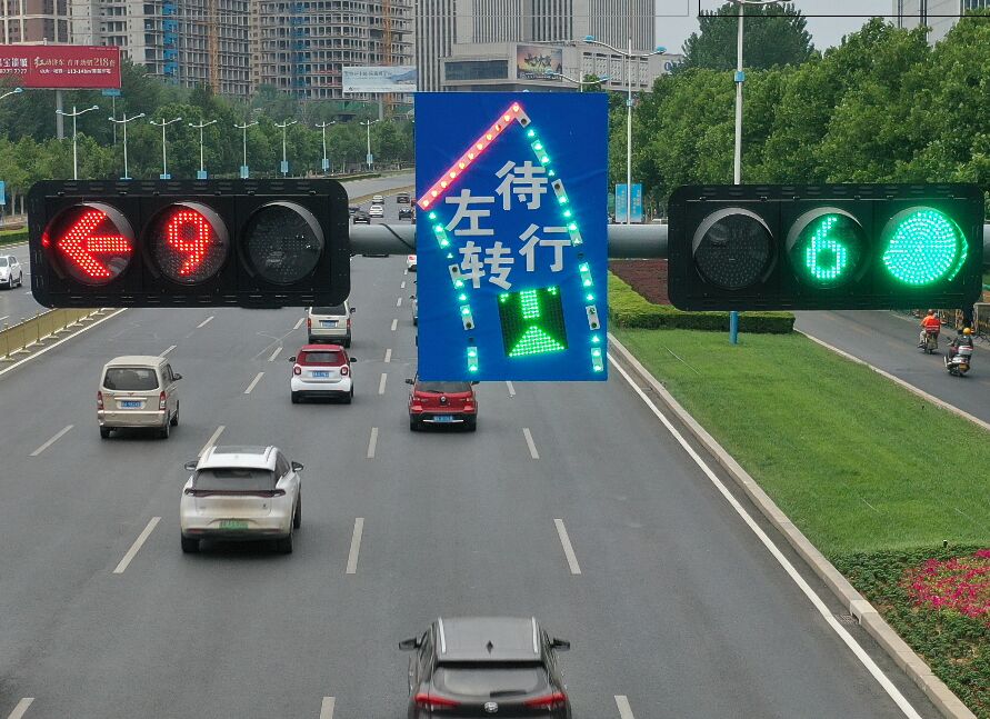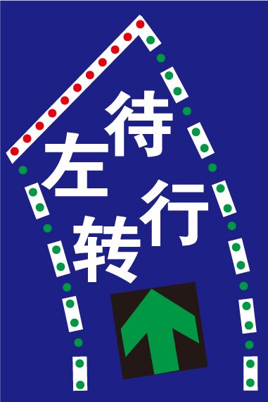 ?2、工藝說明:標志版面由LED發(fā)光管組成停車線、邊緣線、“左轉(zhuǎn)待行”文字;由顯示屏動態(tài)(P10)顯示紅、黃、綠三色動態(tài)箭頭,通過控制模塊調(diào)取信號燈燈色狀態(tài),在標志版面形成動態(tài)三種狀態(tài),動態(tài)引導(dǎo)待轉(zhuǎn)車流通行權(quán)限。