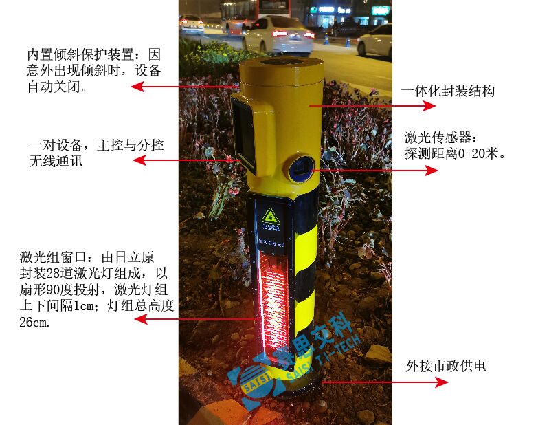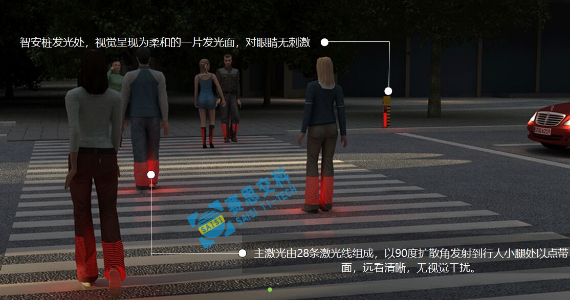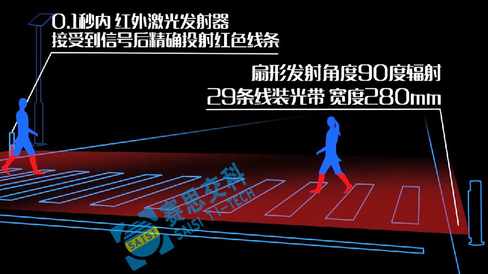 當(dāng)行人即將進(jìn)入斑馬線將要過(guò)街的瞬間,本裝置快速、準(zhǔn)確檢測(cè)到有行人過(guò)街,立刻投射28條紅色激光線到過(guò)街行人小腿處,形成明顯的紅色區(qū)域投影警示,機(jī)動(dòng)車(chē)駕駛員可以在照明不足、注意力不集中或視線受影響情況下(對(duì)面車(chē)輛遠(yuǎn)光、雨霧天氣等),遠(yuǎn)距離得到紅色警示和發(fā)現(xiàn)行人動(dòng)態(tài),并及時(shí)做出反應(yīng),從而減少交通意外的發(fā)生。