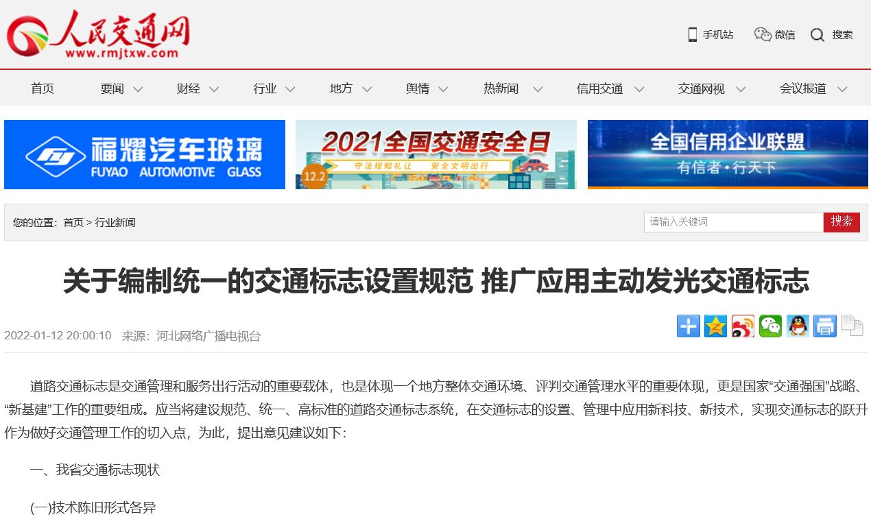 附件:“人民交通網(wǎng)”2022年1月12日發(fā)文《關(guān)于編制統(tǒng)一的交通標志設置規(guī)范 推廣應用主動發(fā)光交通標志》截圖。