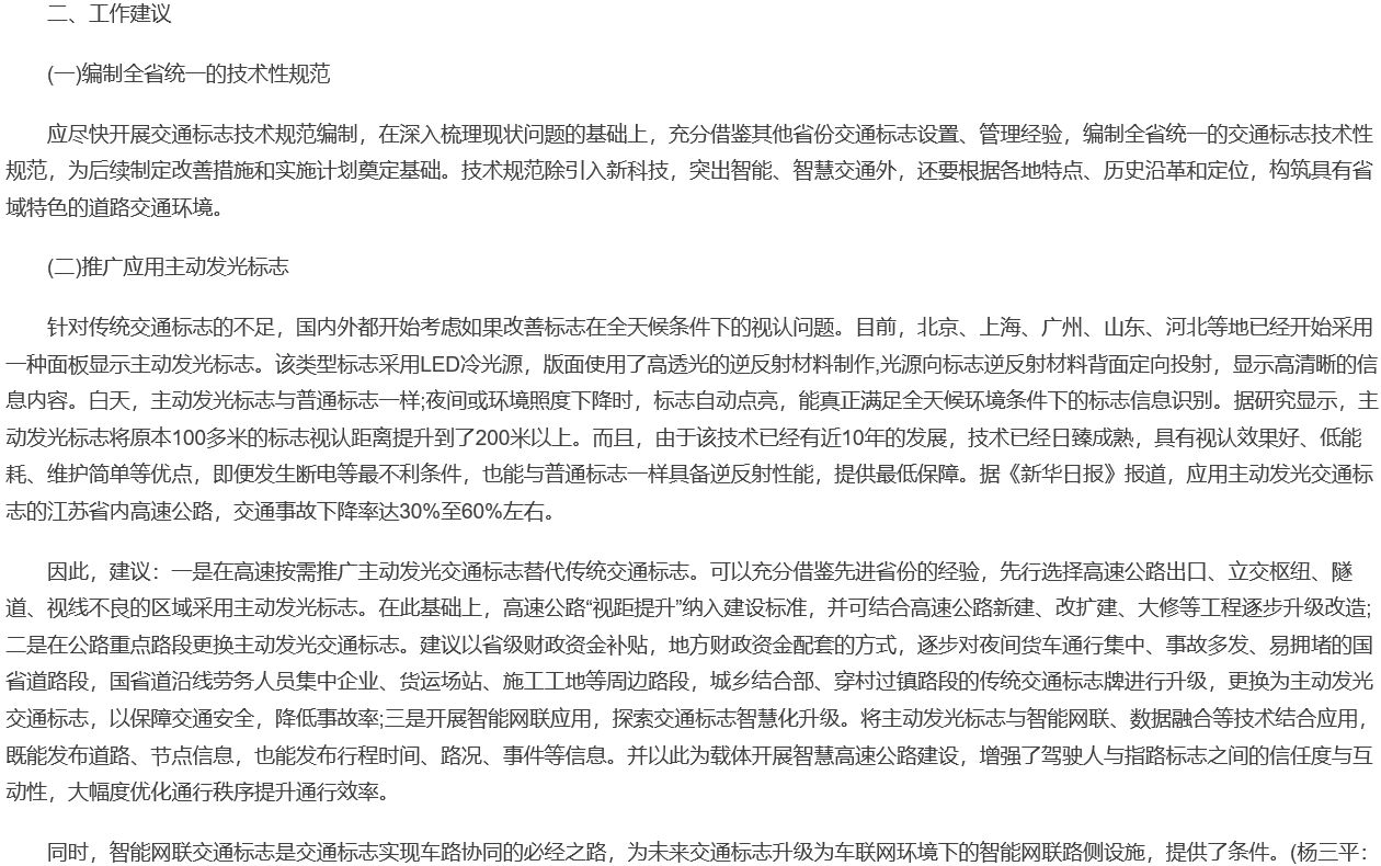主動發(fā)光標志,因其具備獨特的功能優(yōu)勢,主要有:(1)能主動發(fā)光,不需依賴汽車遠光燈照射;(2)提升標志的遠距離視認性;(3)增強標志的易捕捉性和警示性;(4)增強標志在雨、霧、冰、雪、霾、逆光等惡劣交通環(huán)境中,仍能保持良好的顯示效果。上述功能能彌補在特殊交通環(huán)境中普通逆反射標志的功能不足現(xiàn)象。為此,文中還給出相關(guān)建議:“一是在高速按需推廣主動發(fā)光交通標志替代傳統(tǒng)交通標志。可以充分借鑒先進省份的經(jīng)驗,先行選擇高速公路出口、立交樞紐、隧道、視線不良的區(qū)域采用主動發(fā)光標志。在此基礎(chǔ)上,高速公路“視距提升”納入建設標準,并可結(jié)合高速公路新建、改擴建、大修等工程逐步升級改造;二是在公路重點路段更換主動發(fā)光交通標志。建議以省級財政資金補貼,地方財政資金配套的方式,逐步對夜間貨車通行集中、事故多發(fā)、易擁堵的國省道路段,國省道沿線勞務人員集中企業(yè)、貨運場站、施工工地等周邊路段,城鄉(xiāng)結(jié)合部、穿村過鎮(zhèn)路段的傳統(tǒng)交通標志牌進行升級,更換為主動發(fā)光交通標志,以保障交通安全,降低事故率;三是開展智能網(wǎng)聯(lián)應用,探索交通標志智慧化升級。將主動發(fā)光標志與智能網(wǎng)聯(lián)、數(shù)據(jù)融合等技術(shù)結(jié)合應用,既能發(fā)布道路、節(jié)點信息,也能發(fā)布行程時間、路況、事件等信息。并以此為載體開展智慧高速公路建設,增強了駕駛?cè)伺c指路標志之間的信任度與互動性,大幅度優(yōu)化通行秩序提升通行效率?!?br />