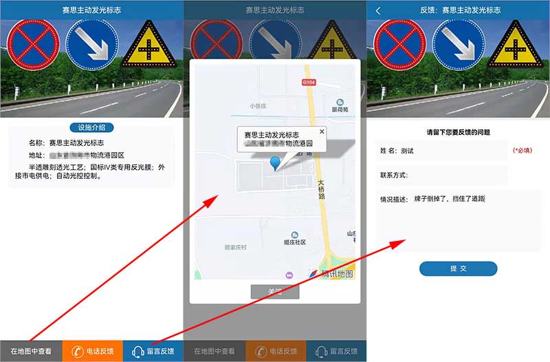手機掃描二維碼后打開設(shè)施設(shè)備詳情頁面,可看到當(dāng)前設(shè)施設(shè)備的詳細(xì)資料,可通過地圖查看當(dāng)前位置,也可通過撥打電話、留言反饋等方式向后臺反映問題。不僅方便了公眾查詢自己當(dāng)前位置及相關(guān)情況,也方便設(shè)施設(shè)備維護機構(gòu)對出現(xiàn)問題的設(shè)施設(shè)備進行及時維護。