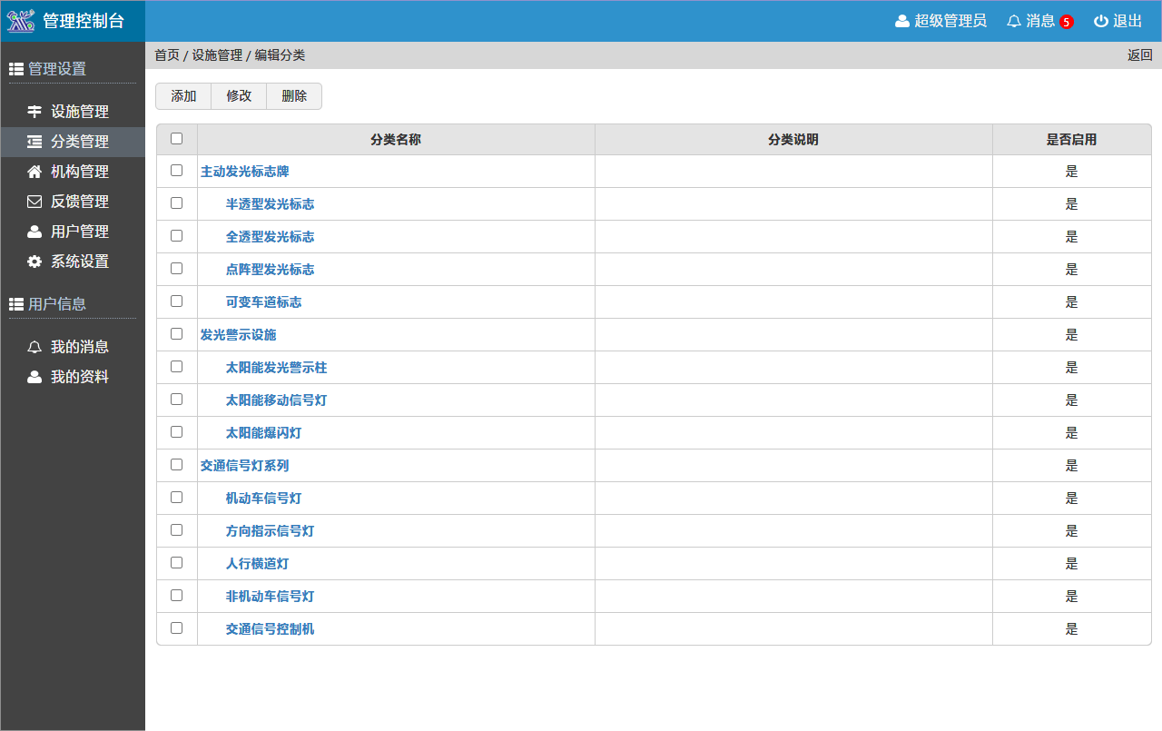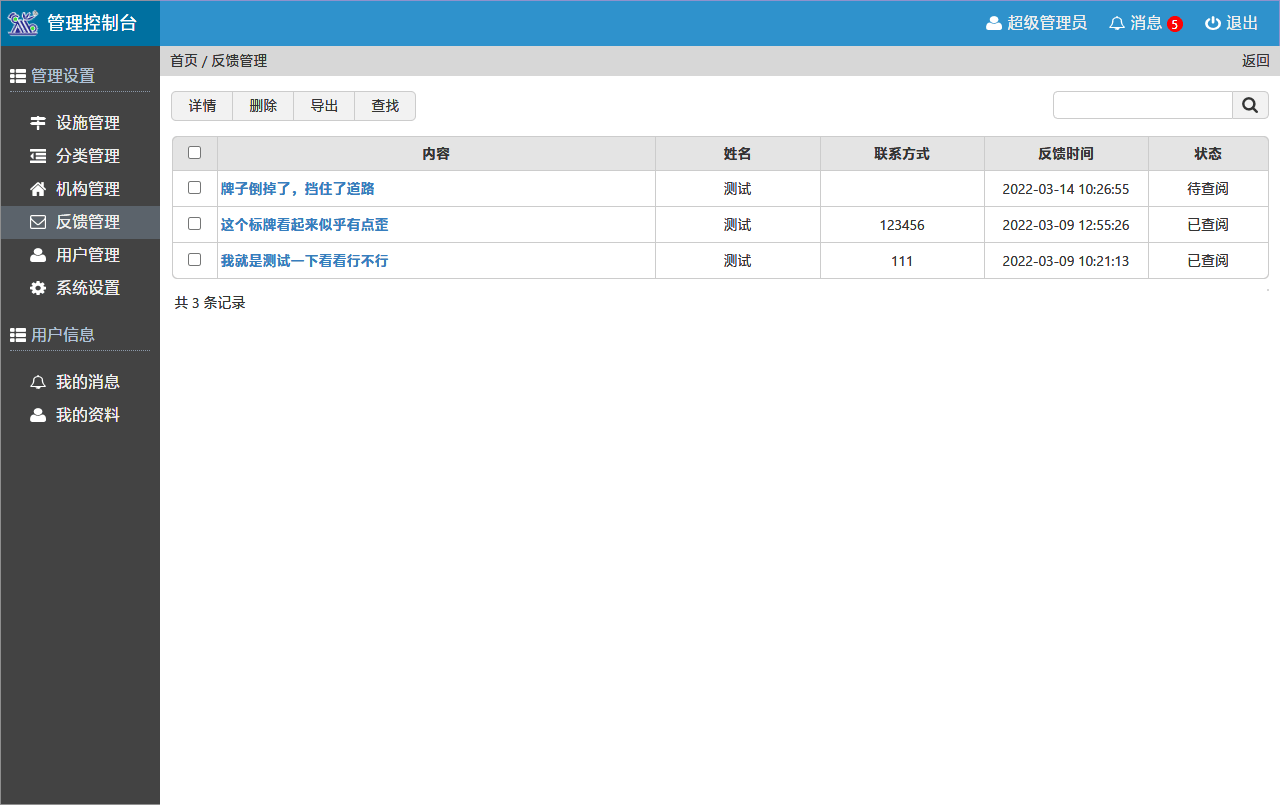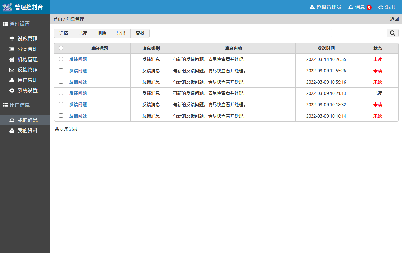 設(shè)施管理系統(tǒng)擁有完善的后臺管理功能,可按列表添加設(shè)施設(shè)備,可按層級添加分類、機構(gòu)。可以添加多個管理用戶,并設(shè)置不同管理權(quán)限。當(dāng)收到反饋信息后,能及時顯示新消息數(shù)量。在反饋管理模塊中,可查看當(dāng)前反饋的信息列表,及時處理對應(yīng)問題。