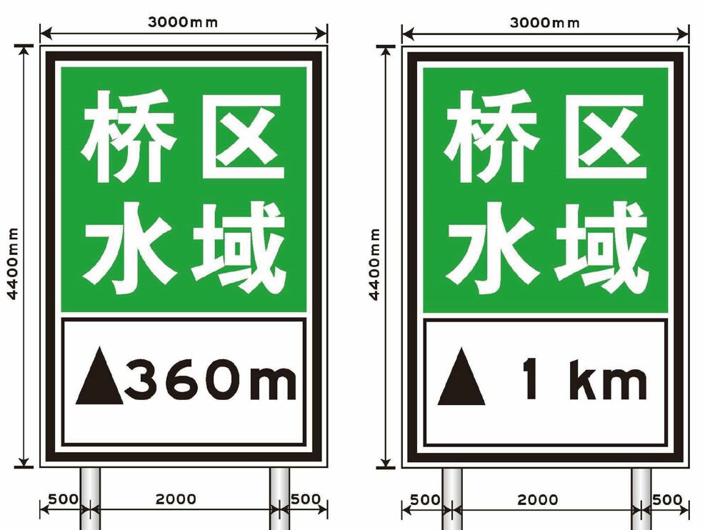 “橋區(qū)水域”航道指示標(biāo)志,設(shè)置于河道兩岸合適位置,主要用于告知通行船舶注意前方橋區(qū)水域的劃定范圍,方便船舶駕駛員能準(zhǔn)確、及時獲取航道水域相關(guān)信息。其版面分上下兩部分:上部,藍底白字(橋區(qū)水域);下部,白底黑字(三角+距離數(shù)字);整體黑色邊框。版面尺寸通常為:3000mm *4400mm。通常采用雙立柱安裝方式。如下圖所示: