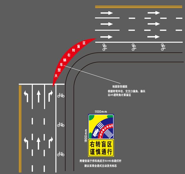 穿村鎮(zhèn)公路,不同于市區(qū)道路,肯定是在物流線路規(guī)劃區(qū)域內(nèi),貨車流量必然有所分布,而貨車駕駛存在一個最大的操作性隱患,即:“大貨車右輪視距盲區(qū)”,這類專題,很多專業(yè)論文及“公眾號”都有專文闡述,此處不在詳述。推薦部分發(fā)光標(biāo)志版面如下: