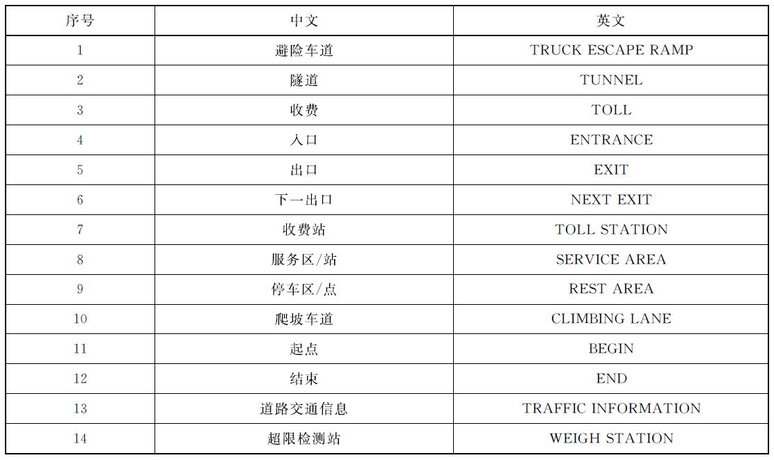 3、如采用英文專用名詞,宜全部大寫。如:安全出口,為“EXIT”;又如收費(fèi),為“TOLL”,《交通標(biāo)志專用名詞中英文對照表》詳見下表所示:
