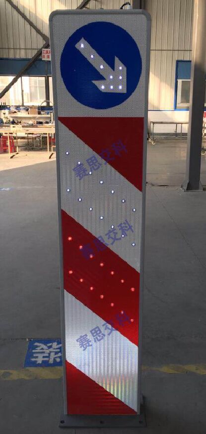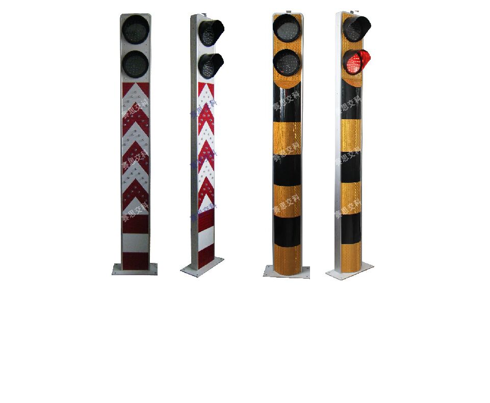 2、基本說(shuō)明:采用一體式柱體結(jié)構(gòu),標(biāo)志版面圖案中嵌入LED發(fā)光管,柱體上設(shè)置警示發(fā)光管,采用太陽(yáng)能蓄電池供電,設(shè)置于中央隔離帶端口。