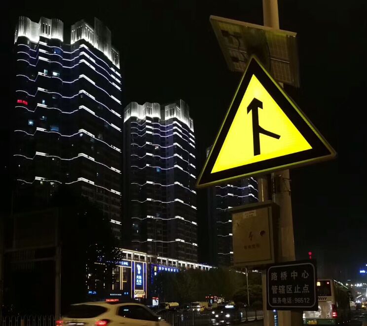 標志版面整體發(fā)光,對于禁令、警告類有紅、黃、黑等深色系列反光膜的,能通過版面中的白色透光膜來反襯圖案,標志整體發(fā)光面柔和,適合亮化、景觀等暗環(huán)境中的發(fā)光點綴。