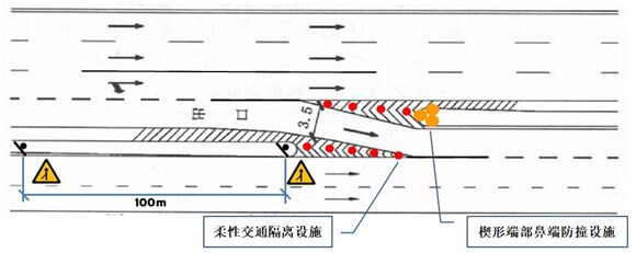 (4)應(yīng)在入口三角楔形端部鼻端處安放必要防車輛碰撞設(shè)施,最簡(jiǎn)易的操作即3個(gè)防撞桶;并建議在此處安裝一盞霧燈(持續(xù)閃爍)或一塊(兩側(cè)通行)太陽(yáng)能點(diǎn)陣式線形誘導(dǎo)標(biāo)(即太陽(yáng)能道口標(biāo))。